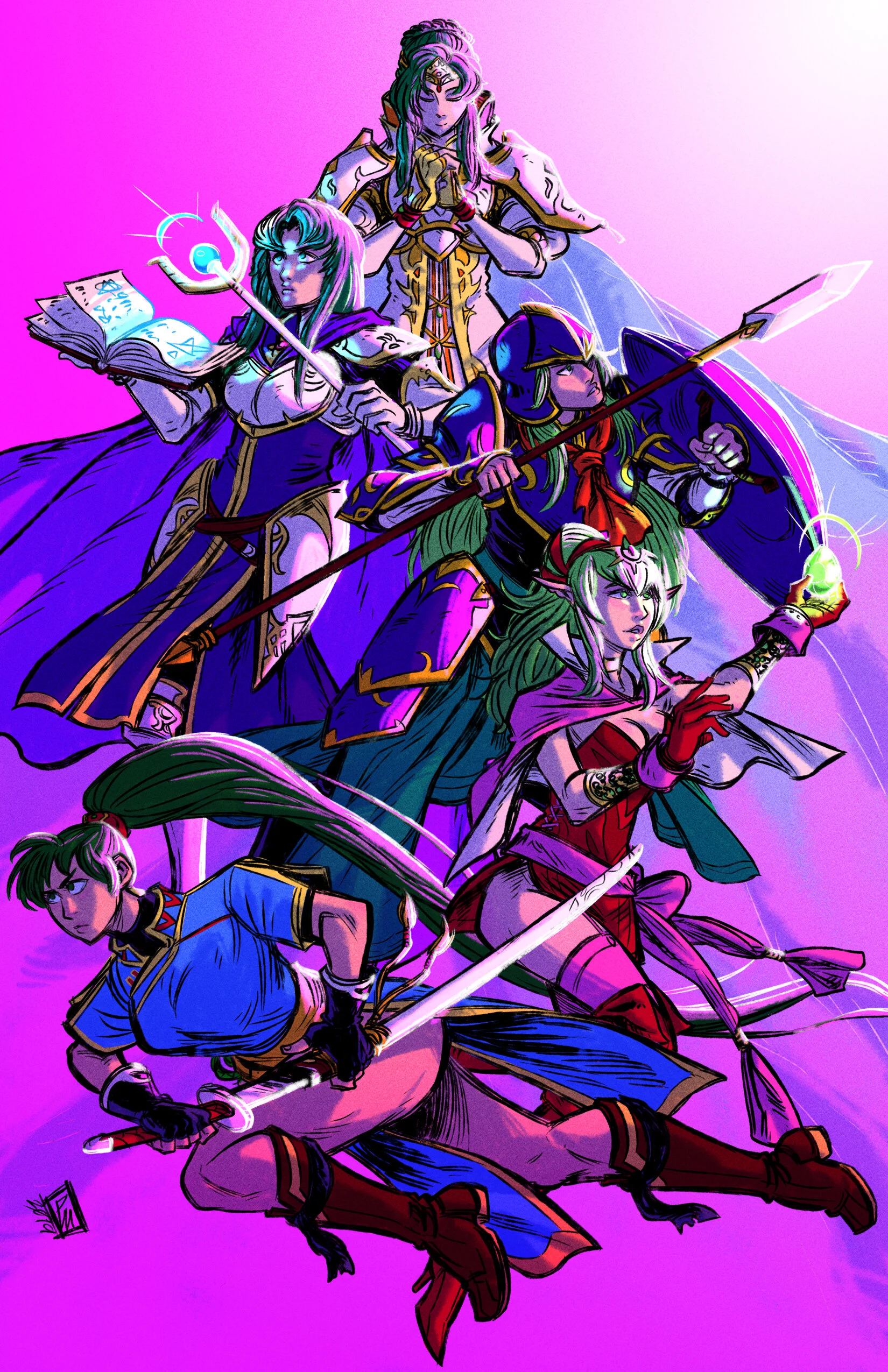 Three Tiefling characters (Misra, Kathiss, and Virael) after having been with each other for a few years (+some Flumphs!)